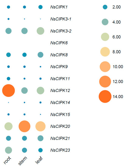 Comparative analysis of the relative expression of CIPK genes in different tissues of N. sibirica. Different circle sizes and colors indicate the relative expression size. The expression of CIPK1 in the root was used as a reference for all relative quantification.