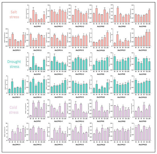 Expression analysis of NsCIPKs in response to salt, drought, and cold stress. A student’s t-test was used to analyze statistically significant differences (* p < 0.05, ** p < 0.01).