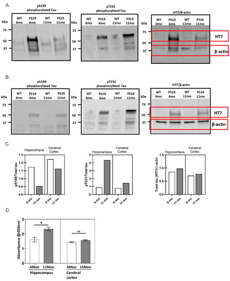 The phosphorylation characteristics of PS19 transgenic mice brain extracts. Immunoblot of phosphorylated tau at Ser199 (pS199), Thr231 (pT231), and total tau (HT7) detected in the crude cell lysate of 6- and 11-month-old wild type (WT) and P301S (PS19) mice hippocampus (A) and cerebral cortex (B). (C) Quantification of the relative ratio of tau markers, pS199 and pT231, to total tau for PS19 mice hippocampus and cerebral cortex at 6- and 11-month-old (normalized to the average level in 6-month-old PS19 mice counterpart, which was set to 1. Total tau level was normalized to an endogenous control, β-actin. (D) The oligomeric tau content in crude cell lysates from 6- and 11-month-old PS19 mice hippocampus and cerebral cortex was measured and quantified by ELISA assay (* represents p < 0.05 between average of different groups, n = 3; ns = not significant).