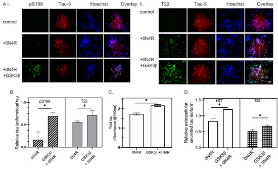 The phosphorylation characteristics of PS19 transgenic mice brain extracts. Characterization of SH-SY5Y cells transfected with wild type 0N4R and GSK3β constructs. Representative fluorescent images of tau markers, including pS199 (Green)/Tau-5 (Red)/Hoechst (Blue) (A(i)) and T22(Green)/Tau-5 (Red)/Hoechst (Blue) (A(ii)) for SH-SY5Y cells three days post-transfection. Scale bar = 100 µm. (B) Quantitative analysis of fluorescence intensity of pS199 (dark gray hatched bars) and T22 (light gray solid bars), normalized to Tau-5+ intensity as a measure of the total tau expression, for SH-SY5Y cells expressing 0N4R tau with GSK3β co-transfection (GSK3β + 0N4R) or without GSK3β (0N4R), where * represents p < 0.05 for n = 3. (C) The oligomeric and total tau were measured by sandwich ELISA of SH-SY5Y cell lysates using T22 and human tau antibody, respectively. * p < 0.05 for 0N4R compared with GSK3β + 0N4R (n = 3). (D) Total tau (open bars) or oligomeric tau (boxes-filled bars) of the conditioned medium were measured by indirect ELISA using HT7 and T22, respectively, to investigate the effects of phosphorylation on tau secretion. (* represents p < 0.05 for 0N4R compared with GSK3β + 0N4R (n = 3)).