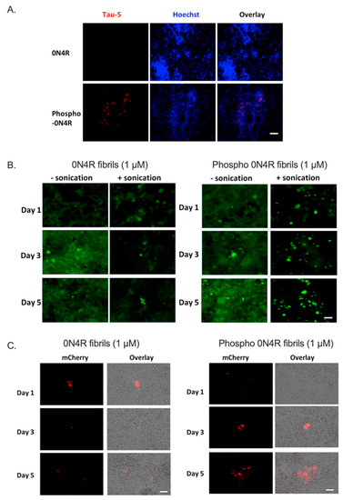 We then evaluated the seeding activities of tau fibrils generated from recombinant 0N4R and phospho-0N4R tau, using previously described FRET tau biosensor cells [30], which have been used widely for assessing the seeding activities from different origins, such as tau fibrils, brain extracts from human AD patients, or tau-transgenic mouse models [31,32]. Here, the FRET biosensor cells were transduced with 1 μM of tau fibrils, induced by the anionic aggregation inducer, heparin, as described in Methods. Fluorescence microscopy was used to monitor and visualize the formation of seed-induced tau aggregation over five days (Figure 4B). Interestingly, cells treated with phospho-0N4R had a higher level of tau in the aggregated state, displaying puncta-like intracellular inclusions as early as day one. More importantly, this effect was further enhanced by one additional step of sonication, indicating both the size and form of seeds significantly affected their potential in inducing tau intracellular aggregation.
