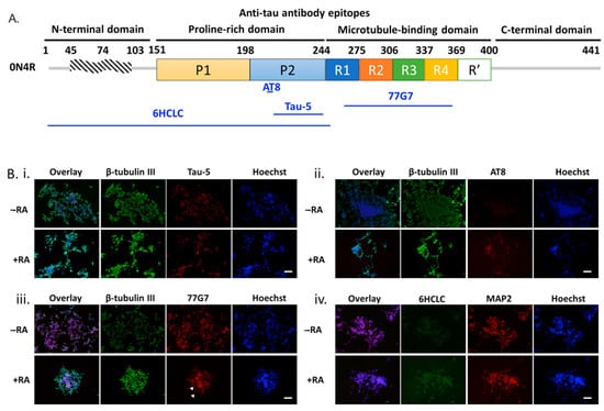 Tau phospho-isoform expression in differentiated SH-SY5Y cells. (A) Schematic illustration of the epitopes on 0N4R tau protein used to identify the tau expression landscape in SH-SY5Y cells. Antibodies include AT8: pSer202 and pThr205; Tau-5: aa 210–241; 77G7: 270–375; 6HCLC: aa 1–254. The residues are numbered based on the full-length tau isoform, 2N4R, with regions of interest as noted. (B) Representative fluorescent images of neuronal and tau markers, including β-tubulin III (Green)/Tau-5 (Red)/Hoechst (Blue) (i), β-tubulin III (Green)/AT8 (Red)/Hoechst (Blue) (ii), β-tubulin III (Green)/77G7(Red)/Hoechst (Blue) (iii), and 6HCLC (Green)/MAP2(Red)/Hoechst (Blue) (iv) for SH-SY5Y cells after 14 days of RA-induced differentiation. Scale bar = 100 µm.