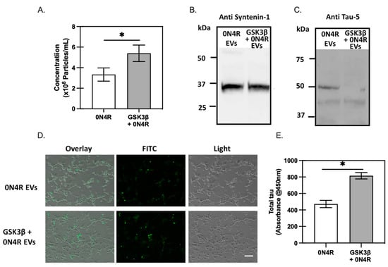 To create tau-enriched EVs, we transfected HEK293 cells with XPack™0N4R, with or without a GSK3β expression plasmid, for expressing tau packed directly into EVs (XPack™ (System Biosciences, Mountain View, CA, USA) construction in Materials and Methods). The supernatants from HEK293 cells transfected with the XPack™-0N4R construct were collected, and EVs were isolated for characterization by ZetaView (Particle Metrix, Ammersee, Germany). Co-transfecting HEK293 cells with GSK3β showed statistically equivalent sizes of isolated EVs from 0N4R control vs. 0N4R + GSK3β group (134.2 ± 2.6 nm vs. 133.7 ± 0.7 nm, respectively) based on three independent replicates. However, the GSK3β-coexpressing group had a higher particle concentration than the 0N4R group (3.3 × 108 per mL vs. 5.4 × 108 per mL), suggesting the presence of GSK3β facilitated the packaging of tau into EVs (Figure 6A). To confirm the identity of exosomes, isolated samples were analyzed by Western blot analysis using anti-Syntenin-1 (Figure 6B), which is a marker of the syndecan–syntenin–alix-dependent pathway of exosome biogenesis [35]. The presence of a positive band at 34 kDa for isolated EV samples confirmed the identity of exosome populations. Lastly, the presence of tau packed into the exosomes was confirmed by Western blotting using Tau-5 antibody for protein samples extracted from exosomes (Figure 6C). Note that lower levels of tau were observed from GSK3β-expressing samples; however, more particles per supernatant volume were also determined in this case, suggesting that tau protein was underrepresented in individual exosomes, as syntenin-1 levels were similar.
