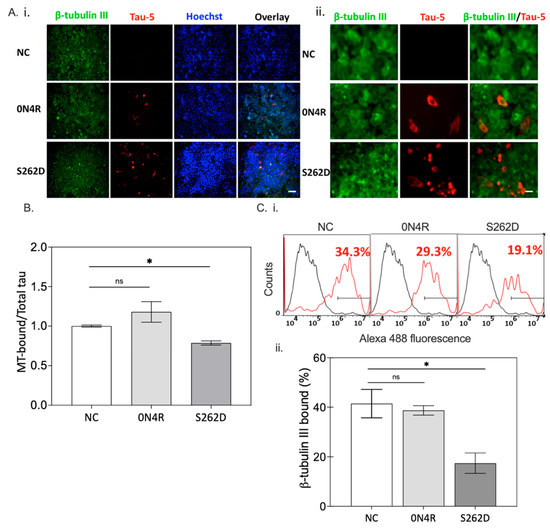 As higher levels of tau were observed for S262D tau transfection relative to wild type, the microtubule binding integrity was investigated by transiently transfecting CHO cells with constructs for the wild type 0N4R or the S262D tau variant. Here, CHO cells were used to provide greater quantities of cell lysates that were necessary for the assay. The expression of microtubule marker β-tubulin III was observed for all the groups (Figure 8A(i),(ii)), while Tau-5 was expressed only in the CHO cells transfected with 0N4R or its variant, S262D. Cells expressing the S262D variant exhibited a higher density of Tau-5 reactivity than that of the 0N4R wild type group, implying a critical role for S262 phosphorylation in tau accumulation.
