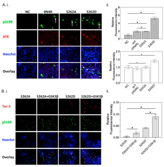 The interplay between Ser262 phosphorylation and GSK3β activity. (A(i)) Expression of phosphorylated tau at Ser199 (pS199, Green) and Ser202/Thr204 (AT8, Red) in CHO cells transfected with wild type 0N4R tau, S262A variant, or S262D variant. NC: CHO cells only. Scale bar = 25 µm. Arrows indicate the differential cellular localization of pS199 expressed by transfected cells. (A(ii)) The intensity of pS199 and AT8 immunostaining in CHO cells transfected with different constructs were normalized by Hoechst staining levels with NC set arbitrarily at 1. (* represents p < 0.05 between two different groups, n = 3; ns = not significant). (B) The effect of Ser262 phosphorylation on the activity of GSK3β was further examined by co-transfecting tau and GSK3β plasmids. The expression of total tau (Tau-5, Red) is shown in (B(i)). (Scale bar = 25 µm.) and quantified (B(ii)). for comparison between different groups (* represents p < 0.05 between two different groups, n = 3; ns = not significant).