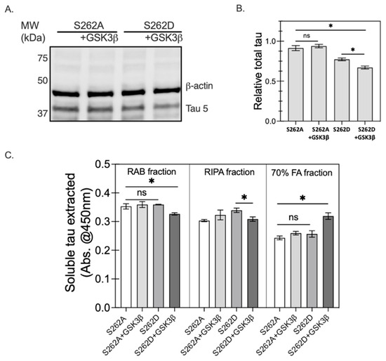 The levels of soluble tau in the cell lysates were evaluated by Western blot analysis. We found that S262D co-transfected with GSK3β exhibited the lowest level of detergent soluble tau among all the groups tested (Figure 10A,B), suggesting the formation of insoluble tau increased. To test this likelihood, we conducted a sequential protein extraction of total cell lysates, followed by ELISA assay to evaluate the detergent-soluble fraction from the total cell lysates recovered under each condition using established methods, where reassembly (RAB) buffer is the mildest and 70% formic acid the strongest [38]. Consistently, cell lysates from cell co-expressing S262D with GSK3β also showed the lowest RAB and RIPA soluble tau among all the groups (Figure 10C). Consistent with the low detergent soluble levels of tau, lysates of cells expressing S262D with GSK3β exhibited the highest amount of 70% formic acid (FA)-soluble tau (Figure 10C). These results have confirmed our hypothesis that Ser262 pre-phosphorylation promotes GSK3β-driven tau phosphorylation, tau accumulation, and insoluble tau formation.
