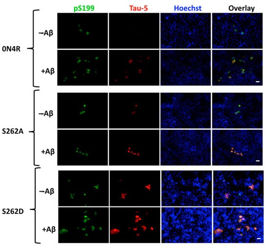 Accumulating evidence suggests that tau acts as the mediator between amyloid-beta (Aβ) and subsequent neurotoxicity, including impaired synaptic plasticity and tau inclusions [39,40]. One previous study using a D. melanogaster model demonstrated that amyloid beta-driven dendritic spine defects and synapse loss were mediated by Ser262 phosphorylation [39]. Here, we evaluated the role of Ser262 phosphorylation in Aβ-induced tau accumulation in CHO cells (Figure 11). A significant increase in the intensity of pS199+ and Tau-5+ cells was observed in the 0N4R group 72 h after the addition of amyloid-beta. However, by blocking the phosphorylation of Ser262 via the S262A substitution, amyloid beta addition showed minimal pS199+ and Tau-5+ cells. Despite the higher level of tau accumulation in the S262D group, addition of amyloid-beta exacerbated pS199+ and Tau-5+ immunoreactive cells detected. Our results suggest Ser262 phosphorylation is a necessary step in amyloid beta-induced tau accumulation and phosphorylation.