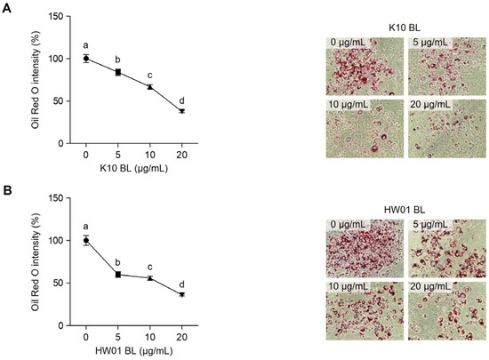 Inhibitory effect of P. acidilactici BLs on lipid accumulation in 3T3-L1 cells. Cells were treated with various concentrations (0, 5, 10, and 20 μg/mL) of P. acidilactici K10 BL (A) or P. acidilactici HW01 BL (B). At day 12, lipid accumulation in 3T3-L1 cells was assessed by Oil Red O staining. Representative microscopic images of Oil Red O-stained cells are shown. Data are expressed as the mean ± standard deviation. Statistical significance between groups was determined by ANOVA when p < 0.05. Significant differences between treatment with K10 BL or HW01 BL are expressed with different letters (a, b, c, d).