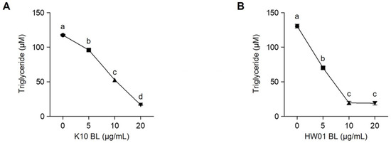 Inhibitory effect of P. acidilactici BLs on cellular triglycerides in 3T3-L1 cells. Cells were treated with various concentrations (0, 5, 10, and 20 μg/mL) of P. acidilactici K10 BL (A) or P. acidilactici HW01 BL (B). At day 12, the amounts of cellular triglyceride were assessed using a commercial triglyceride assay kit. Data are expressed as the mean ± standard deviation. Statistical significance between groups was determined by ANOVA when p < 0.05. Significant differences between treatment with K10 BL or HW01 BL are expressed with different letters (a, b, c, d).