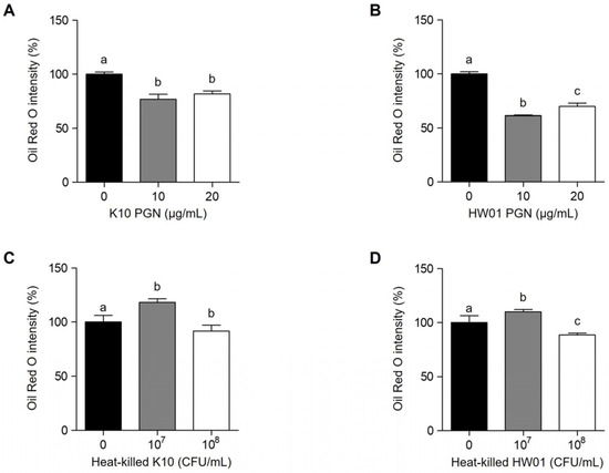 Effect of P. acidilactici PGNs and heat-killed P. acidilactici on lipid accumulation in 3T3-L1 cells. Cells were treated with various concentrations (0, 10, and 20 μg/mL) of P. acidilactici K10 PGN (A) or P. acidilactici HW01 PGN (B). Cells were treated with various concentrations (0, 107 and 108 CFU/mL) of heat-killed P. acidilactici K10 (C) or P. acidilactici HW01 (D). At day 12, lipid accumulation in 3T3-L1 cells was assessed by Oil Red O staining. Data are expressed as the mean ± standard deviation. Statistical significance between groups was determined by ANOVA when p < 0.05. Significant differences between treatment with P. acidilactici PGN (A,B) or heat-killed P. acidilactici (C,D) are expressed with different letters (a, b, c).