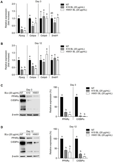 Inhibitory effect of P. acidilactici BLs on the expressions of adipogenic transcription factors in 3T3-L1 cells. Cells were treated with 20 μg/mL of P. acidilactici K10 BL (A) or P. acidilactici HW01 BL (B). At days 3 and 12, the mRNA expressions of Pparg, Cebpa, Cebpb, and Srebf1 genes were measured by real-time quantitative reverse-transcription PCR. Cells were treated with 20 μg/mL of P. acidilactici K10 BL (C) or P. acidilactici HW01 BL (D). At days 3 and 12, cell lysates were collected and subjected to Western blot analysis to determine the protein levels of PPARγ and C/EBPα. Data are expressed as the mean ± standard deviation. Statistical significance between groups was determined by ANOVA when p < 0.05. Significant differences between treatment with K10 BL or HW01 BL are expressed with different letters (a, b, c). NT denotes not treated.