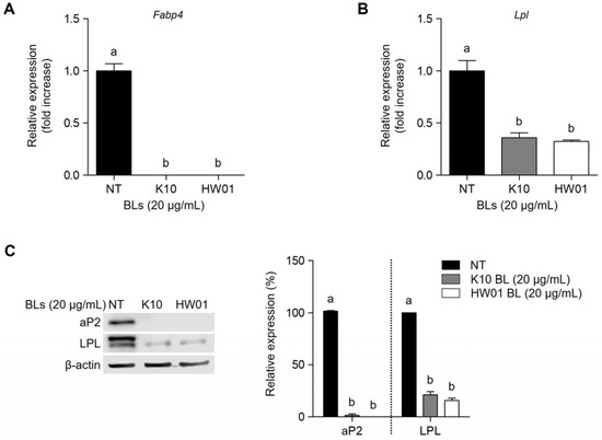 Inhibitory effect of P. acidilactici BLs on aP2 and LPL in 3T3-L1 cells. Cells were treated with 20 μg/mL of P. acidilactici K10 BL or P. acidilactici. At day 12, the mRNA expressions of Fabp4 (A) and Lpl (B) genes were measured by real-time quantitative reverse-transcription PCR. (C) At day 12, cell lysates were collected and subjected to Western blot analysis to determine the protein levels of aP2 and LPL. Data are expressed as the mean ± standard deviation. Statistical significance between groups was determined by ANOVA when p < 0.05. Significant differences between treatment with K10 BL or HW01 BL are expressed with different letters (a, b). NT denotes not treated.