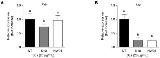 Adipokines, such as resistin and leptin, are cytokines secreted from adipocytes [45]. Resistin is preferentially expressed in adipose tissue and is associated with type 2 diabetes and metabolic syndrome [46,47]. Thus, we also examined whether P. acidilactici BLs inhibited mRNA expression in 3T3-L1 cells. Although K10 BL slightly inhibited the mRNA expression of the resistin gene (Retn), the inhibition by K10 BL was not statistically significant (p > 0.05). Similarly, HW01 BL did not inhibit the mRNA expression of Retn gene (Figure 6A). However, when 3T3-L1 cells were treated with K10 or HW01 BLs, the mRNA expression of Lep gene was significantly inhibited (p < 0.05) (Figure 6B). Leptin can induce the formation of lipid droplets, accelerating the differentiation of 3T3-L1 cells [48]. Thus, leptin is highly associated with obesity [49]. Accordingly, it can be assumed that the decreased leptin expression through the inhibition of PPARγ by P. acidilactici BLs could inhibit the differentiation of 3T3-L1 cells.