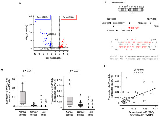 Expression of miR-139-5p and miR-139-3p in CRC clinical specimens. (A) Volcano plot of the miRNA expression signature based on miRNA sequencing (GEO accession number: GSE183437). The log2 fold-change (FC) is plotted on the x-axis and the log10 p-value on the y-axis. The blue points represent the downregulated miRNAs with log2 FC < −2.0 and p < 0.05. The red points represent the upregulated miRNAs with log2 FC > 2.0 and p < 0.05. Downregulated expressions of miR-139-5p and miR-139-3p are plotted. (B) Chromosomal location of pre-miR-139 in the human genome. The mature sequences of miR-139-5p (the guide sequence) and miR-139-3p (the passenger strand) are shown. (C) Expression levels of miR-139-5p and miR-139-3p validated in CRC clinical specimens and CRC cell lines (HCT116 and DLD-1). The expression of both miRNAs was significantly downregulated in cancer tissues (p < 0.001). (D) Spearman’s rank test showed positive correlations between miR-139-5p and miR-139-3p expression levels in clinical specimens (r = 0.559, p < 0.001).