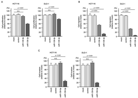 Tumor-suppressive functions of miR-139-5p and miR-139-3p in CRC cells (HCT116 and DLD-1). (A) Cell proliferation assessed by XTT assay. At 72 h after transient transfection of miRNAs, cancer cell viability was analyzed. (B) Cell migration ability assessed using a membrane culture system. At 48 h after miRNA transfection, the cells were seeded into the migration chambers. (C) Cell invasion ability assessed by Matrigel invasion assay. At 48 h after miRNA transfection, the cells were seeded into the invasion chambers. (N.S.: not significant compared to mock group.).