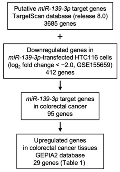 The following hypotheses regarding miR-139-3p target genes in CRC cells were made: the target genes of miR-139-3p have one or more binding site(s), are downregulated after miR-139-3p transfection in CRC cells, and are upregulated in CRC tissues. We combined the gene expression data from two databases (TargetScan and GEPIA2) with gene expression data from miR-139-3p-transfected CRC cells (GSE155659) to search for genes that meet these three criteria. A flowchart of the search strategy is shown in Figure 3. A total of 95 putative targets of miR-139-3p in CRC cells were identified.