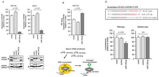 Next, RNA immunoprecipitation (RIP) analysis was performed to confirm that KRT80 mRNA was incorporated into the RNA-induced silencing complex (RISC) after miR-139-3p transfection. The RIP assay concept is illustrated in a schematic in Figure 4B. In samples subjected to immunoprecipitation using an Argonaute2 (AGO2) antibody, quantitative real-time reverse-transcription PCR (qRT-PCR) showed that the KRT80 mRNA level was significantly higher than that in mock and miRNA control-transfected cells (p < 0.001; Figure 4B). Ago2-bound miR-139-3p and KRT80 mRNA were isolated by immunoprecipitation using the AGO2 antibody, suggesting that the RISC plays a central role in miRNA biogenesis (Figure 4B).