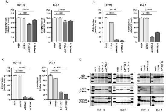The tumor-suppressive functions of miRNAs were evaluated by transient transfection assays using mature miR-139-5p and miR-139-3p. The tumor-promoting functions of KRT80 (loss-of-function assays) were assessed by siRNA transfection assays using siRNAs targeting KRT80. Functional assays (proliferation, migration, and invasion assays) were performed according to procedures of previous studies [51,52]. Briefly, for proliferation assays, HCT116 or DLD-1 cells were transferred into 96-well plates at 3.0 × 103 cells/well. Cell proliferation was assessed using XTT assay kit II (Sigma-Aldrich, St. Louis, MO, USA) 72 h after the transfection procedure. For the migration and invasion assay, HCT116 and DLD-1 cells were transfected in 6-well plates at 3.0 × 105 cells/well; 48 h later, transfected HCT116 and DLD-1 cells were added to each chamber at 1.0 × 105 cells/well. Corning BioCoatTM cell culture chambers (Corning, Corning, NY, USA) were used for the migration assay and Corning BioCoat Matrigel Invasion Chambers were used for the invasion assay. cells on the underside of the chamber membrane were stained and counted for analysis. All experiments were performed in triplicate. The details of the reagents used in these analyses are listed in Table S2.