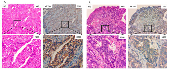 Immunohistochemical staining of KRT80 in CRC clinical specimens. Hematoxylin and eosin (HE) staining and KRT80 immunohistochemical staining in two colorectal cancer patients: (A) female aged 75 years with stage IV CRC, (B) male aged 82 years with stage IIIC CRC. The slides on the left show HE staining, and those on the right side show KRT80 immunohistochemical staining at 40× (upper) and 200× (lower) magnifications. KRT80 immunohistochemical staining showed that staining was confined to cancer tissues, with no staining in the stroma or mucus components.