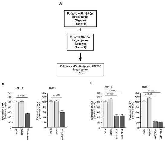 Regulation of HK2 expression by miR-139-3p and KRT80 in CRC cells. (A) Identification of genes commonly regulated by miR-139-3p and KRT80 in CRC cells. (B) Reduced expression of HK2 after miR-139-3p transfection in CRC cells (HCT116 and DLD-1). At 72 h after miRNA transfection, the cells were subjected to real-time PCR. (C) Reduced expression of HK2 after transfection of siRNAs targeting KRT80 in CRC cells (HCT116 and DLD-1). At 72 h after siRNA transfection, the cells were subjected to real-time PCR.