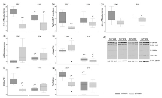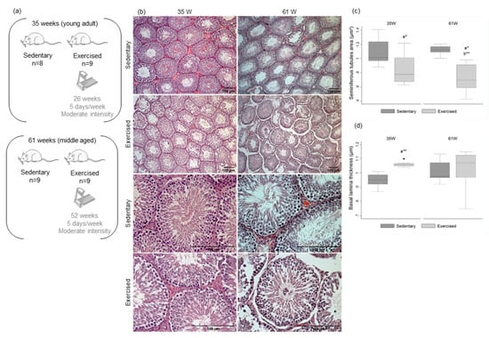 - Joseph, A.-M.; Nguyen, L.M.-D.; Welter, A.E.; Dominguez, J.M.; Behnke, B.J.; Adhihetty, P.J. Mitochondrial adaptations evoked with exercise are associated with a reduction in age-induced testicular atrophy in Fischer-344 rats. Biogerontology 2014, 15, 517–534. [Google Scholar] [CrossRef]