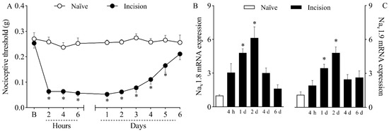 Mechanical hypernociception and increased expression of Nav1.8 and Nav1.9 in the dorsal root ganglia (DRG) caused by plantar incision. Mice were induced to the plantar incision model of postoperative pain. No surgical procedures were performed on naïve mice. (A) The mechanical nociceptive threshold (axis of ordinates) was evaluated at baseline (B) and at different times in hours and days after plantar incision (axis of abscissas). Values represent the filament weight (g) to which mice respond in 50% of presentations. Data are expressed as means ± SD (n = 6). * p < 0.05 compared with naïve group. Two-way ANOVA followed by Bonferroni’s test. (B,C) The levels of Nav1.8 (B) and Nav1.9 (C) mRNA in the DRG (axis of ordinates) were determined by Real-Time PCR at different times in hours (h) and days (d) after plantar incision (axis of abscissas). Target gene expression (2−ΔΔCt) was determined using Gapdh as housekeeping gene. Data are expressed as means ± SD (n = 6). * p < 0.05 compared with naïve group. One-way ANOVA followed by Tukey’s test.