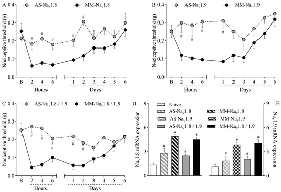 Mice were treated intrathecally with antisense oligodeoxynucleotide targeting Nav1.8 (AS-Nav1.8), Nav1.9 (AS-Nav1.9), both antisense treatments combined (AS-Nav1.8/1.9), mismatch oligodeoxynucleotide targeting Nav1.8 (MM-Nav1.8), Nav1.9 (MM-Nav1.9), or both mismatches combined (MM-Nav1.8/1.9). Mice were treated once a day (10 µg in 5 µL) for four days (final dose of 40 µg) and then induced to the plantar incision model of postoperative pain one hour after the last treatment. No treatments or surgical procedures were performed on naïve mice. (A–C) The mechanical nociceptive threshold (axis of ordinates) was evaluated at baseline (B) and at different times in hours and days after plantar incision (axis of abscissas). Values represent the filament weight (g) to which mice respond in 50% of presentations. Data are expressed as means ± SD (n = 6). # p < 0.05 compared with the respective mismatch group. Two-way ANOVA followed by Bonferroni’s test. (D,E) The levels of Nav1.8 and Nav1.9 mRNA in the DRG (axis of ordinates) were determined by Real-Time PCR two days after plantar incision. Target gene expression (2−ΔΔCt) was determined using Gapdh as housekeeping gene. Data are expressed as means ± SD (n = 6). * p < 0.05 compared with naïve group. # p < 0.05 compared with the respective mismatch group. One-way ANOVA followed by Tukey’s test.