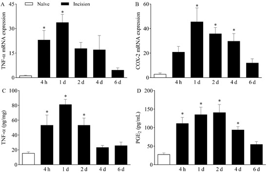 The upregulation of the above-mentioned genes in the DRG was associated with increased plantar skin levels of both TNF-α (Figure 3C) and PGE2 (Figure 3D) in the surgically manipulated paw when compared to naïve mice (p < 0.05). TNF-α levels were significantly higher from four hours to two days after incision, while PGE2 levels were increased from four hours to up to four days following plantar incision.