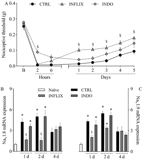Contribution of TNF-α and prostanoids to mechanical hypernociception and upregulation of Nav1.8 and Nav1.9 in the dorsal root ganglia following plantar incision. Mice were treated with the anti-TNF-α monoclonal antibody infliximab (INFLIX; 10 mg/kg, intraperitoneally), the non-selective COX inhibitor indomethacin (INDO; 10 mg/kg, orally), or the vehicle (CTRL; control group). Plantar incision model of postoperative pain was induced one hour later. No surgical procedures nor treatments were performed on naïve mice. (A) The mechanical nociceptive threshold (axis of ordinates) was evaluated at baseline (B) and at different times in hours and days after plantar incision (axis of abscissas). Values represent the filament weight (g) to which mice respond in 50% of presentations. Data are expressed as means ± SD (n = 6). $ p < 0.05 compared with CTRL group. Two-way ANOVA followed by Bonferroni’s test. (B,C) The levels of Nav1.8 mRNA (B) and Nav1.9 mRNA (C) in the DRG (axis of ordinates) were determined by Real-Time PCR at different times in days (d) after plantar incision (axis of abscissas). Target gene expression (2−ΔΔCt) was determined using Gapdh as housekeeping gene. Data are expressed as means ± SD (n = 6). * p < 0.05 compared with naïve group. $ p < 0.05 compared with CTRL group. One-way ANOVA followed by Tukey’s test.