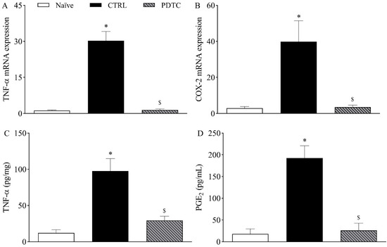 To determine whether TNF-α and COX-2/PGE2 were downstream targets of NF-κB in the mouse model of incisional pain, the expression of these hypernociceptive mediators following the pharmacological inhibition of NF-κB was investigated on the first day after plantar incision. Corroborating previous experiments, the expression of TNF-α mRNA (Figure 6A) and COX-2 mRNA (Figure 6B) in the DRG as well as the plantar skin levels of TNF-α (Figure 6C) and PGE2 (Figure 6D) following plantar incision were increased when compared to naïve mice (p < 0.05). The treatment with the NF-kB antagonist PDTC (100 mg/kg, intraperitoneally) significantly reduced the expression of TNF-α mRNA (Figure 6A) and COX-2 mRNA (Figure 6B) in the DRG and the plantar skin levels of TNF-α (Figure 6C) and PGE2 (Figure 6D) when compared to the control mice (p < 0.05).