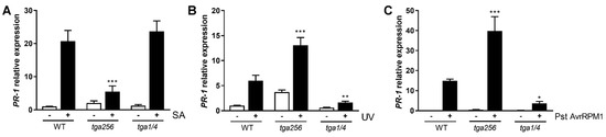 In Arabidopsis, the expression of the defense gene PR-1 depends on members of the TGA transcription factors’ family [19]. In the tga256 triple mutant plant lacking the TGA clade II, PR-1 expression is highly reduced in response to SA treatments compared to WT plants (Figure 1a). This result supports the dependency of TGA transcription factors from clade II for the induction of PR-1 in response to isonicotinic acid (INA, a functional analog of SA) treatment, as previously reported by [29]. In contrast, the tga256 mutant showed higher levels of PR-1 than were seen in WT in response to UV-C or P. syringae pv tomato (Pst) DC3000/AvrRPM1 (Figure 1b,c). This was surprising since both treatments are known to induce SA accumulation in WT [32,33]. The tga2-1/tga5-1 double mutant did not show statistically significant differences in PR-1 expression compared to the control genotype (Figure S1). We also tested PR-1 expression in plants lacking TGA transcription factors from clade I (TGA1 and TGA4), described as positive regulators of SA accumulation [23]. These plants showed PR-1 expression that was lower than that seen in WT plants in response to either UV-C treatment or Pst DC3000/AvrRPM1 inoculation (Figure 1b,c).