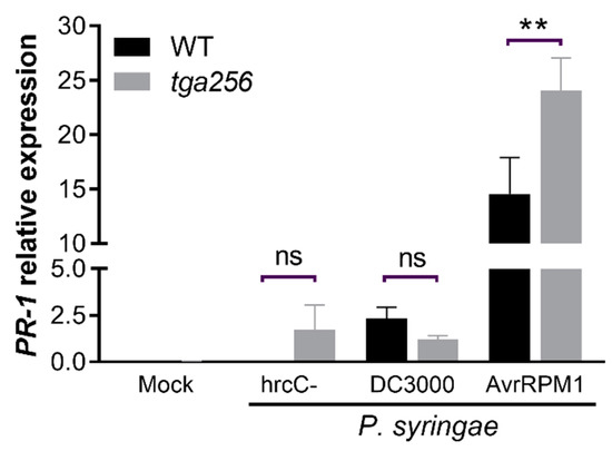 To further explore the roles of the clade II TGA factors, we evaluated PR-1 expression in the tga256 mutant plants during the PTI and effector-triggered susceptibility (ETS) triggered by a Pseudomonas strain able to produce disease in the host. The PTI response was induced by the P. syringae pv tomato DC3000 hrcC− strain that does not secrete virulence effectors [34], while the ETS response was triggered by the virulent Pseudomonas strain Pst DC3000 [35]. We measured PR-1 transcript 24 h after inoculation, and we found that Pst DC3000 and Pst DC3000/AvrRPM1 strains induced the PR-1 transcript accumulation compared to the mock condition on WT plants (p = 0.0093 and p = 0.0045, respectively). Nevertheless, we only found a statistically significant difference between WT and tga256 plants in the response (ETI) triggered by Pst DC3000/AvrRPM1 (Figure 2). Even though we observed a slight difference in the PR-1 transcript in the response triggered by Pst hrcC− between the analyzed genotypes, it was not statistically significant (p = 0.297, Figure 2).