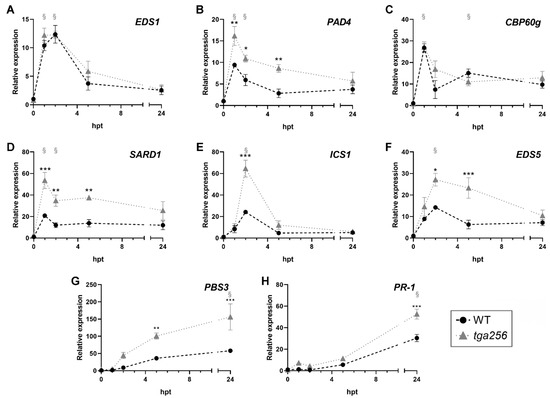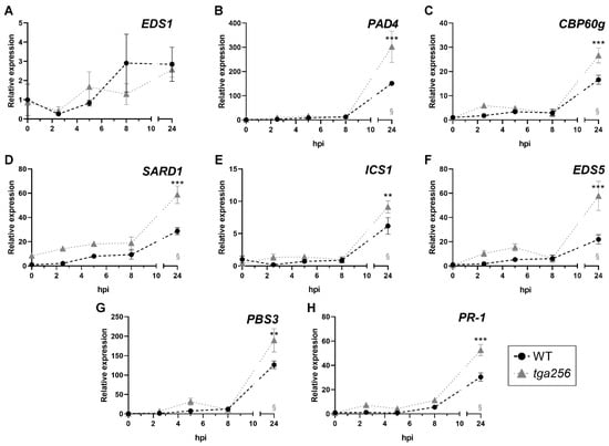 Inoculation with the avirulent P. syringae DC3000/AvrRPM1 induces the upregulation of genes that participate in SA accumulation in the tga256 mutant compared to the WT plants. Four-week-old WT (black circles) and tga256 mutant (gray triangles) plants were syringe-infiltrated with Pst DC3000/AvrRPM1 ODλ600 = 0.01. Samples were collected 2.5, 5, 8, and 24 h post inoculation (hpi). Non-inoculated plants were used as controls. RNA was extracted and the gene expression of (A) EDS1, (B) PAD4, (C) CBP60g, (D) SARD1, (E) ICS1, (F) EDS5, (G) PBS3, and (H) PR-1 genes was evaluated by RT-qPCR. The data represents the mean of the relative gene expression ± SEM from four biological replicates. Asterisks indicate statistical differences according to a 2-way ANOVA and Sidak’s post-test comparing the tga256 mutants with the WT plants at a given time point (**: p < 0.01, ***: p < 0.001). § indicates statistically significant differences in the gene expression at the indicated time compared to the control condition (0) in the WT genotype (p < 0.05, Dunnet’s post-test).