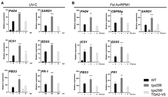 The expression of TGA2 in the tga256 mutant background rescues the upregulated expression of genes associated with SA accumulation upon UV-C and Pst DC3000/AvrRPM1 treatments. WT, tga256, and tga256/TGA2-V5 plants were (A) irradiated with UV-C or (B) inoculated with Pst DC3000/AvrRPM1 (Pst Avr). Unirradiated or non-inoculated plants were used as controls (−), respectively. The expression of the indicated genes was evaluated at the time when the genes were differentially expressed between the genotypes WT and tga256. In the case of pathogen inoculation, gene expression was measured at 24 hpi (+). Samples were frozen and RNA was extracted. Gene expression was evaluated by RT-qPCR. The data represents the mean of the relative gene expression ± SEM. Asterisks indicate statistical differences between the mutant genotypes compared to the WT plants according to a 2-way ANOVA and Sidak’s post-test (*: p < 0.05, **: p < 0.01, ***: p < 0.001). Three biological replicates were evaluated for UV-C treatments; four biological replicates were evaluated in the Pst DC3000/AvrRPM1 treatments.