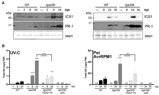 We detected the ICS1 protein at 24 hpi with the Pst DC3000/AvrRPM1 strain in WT plants. Consistent with the result in response to UV-C, the tga256 mutant plants displayed increased ICS1 accumulation compared to WT plants at 24 hpi (Figure 6a, right panel). PR-1 protein levels were also higher in the tga256 mutant plants compared to the WT in the ETI response triggered by Pst DC3000/AvrRPM1 at 24 and 30 hpi. The dynamics of ICS1 and PR-1 protein accumulation correlated very well with transcript induction patterns (Figure 3 and Figure 4) and were slower during Pst DC3000/AvrRPM1 infection compared to UV-C treatment.