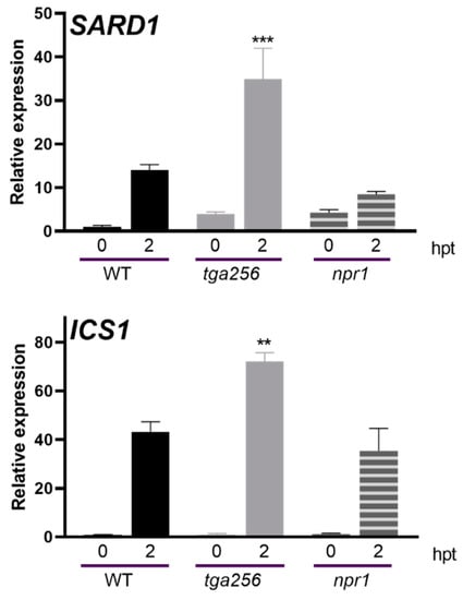 2.2. TGA2 Negatively Regulates the Expression of Isochorismate Pathway-Related Genes upon Stress