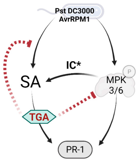 The ETI response activates PR-1 in an SA-dependent and an SA-independent fashion. The activation of PR-1 depends on TGA from clade II in the pathway dependent on SA. On the other hand, Mitogen–Activated Protein Kinases 3 and 6 (MPK3/6) activation triggers the SA-independent PR-1 induction [44]. Additionally, the activation of MPK3 induces the activation of genes that participate in SA accumulation (IC*) independently of SA [44]. According to our model, TGA factors from clade II (TGA) can repress the MPK3/6 branch. Thus, in the tga256 mutant plants, the repression of TGA over the MPK branch is absent, permitting increased SA accumulation (Figure 6), the genes (Figure 4), and the PR-1 expression (Figure 1) dependent on MPKs. It is also possible, and not mutually exclusive, that upon stimulation of SA accumulation by ETI, the TGA factors negatively feedback on SA accumulation by suppressing a step upstream of SA accumulation, independent of MPK3/6 signaling.