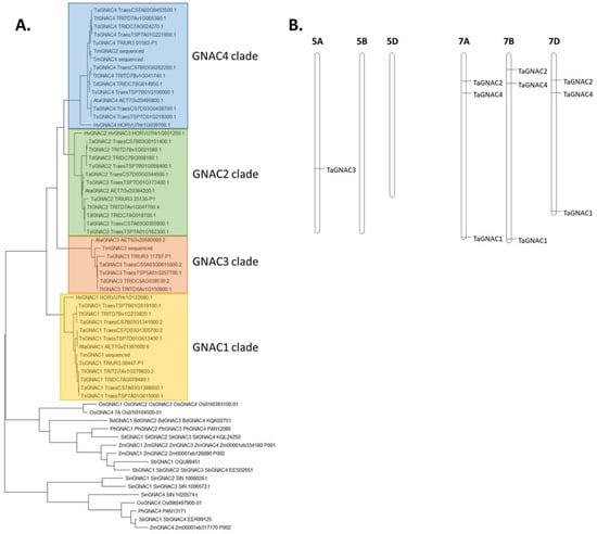 (A) Unrooted phylogenetic tree of the four TaGNAC of bread wheat (i.e., 10 sequences) and their orthologous sequences amplified in T. monococcum and identified by blast in 13 other cereals. Ata: Aegilops tauschii, Bd: Brachypodium distachyon, Hv: Hordeum vulgare, Os: Oryza sativa, Ph: Panicum hallii, Sb: Sorghum bicolor, Sin: Sesamum indicum, Sit: Setaria italica, Ta: Triticum aestivum, Td: Triticum dicoccoides, Tm: Triticum monococcum, Ts: Triticum spelta, Tt: Triticum turgidum, Tu: Triticum urartu, Zm: Zea mays. (B) Chromosomal anchorage of the three homeologs of TaGNAC1, TaGNAC2 and TaGNAC4 on chromosome 7 and the only-known homeolog of TaGNAC3 on chromosome 5.