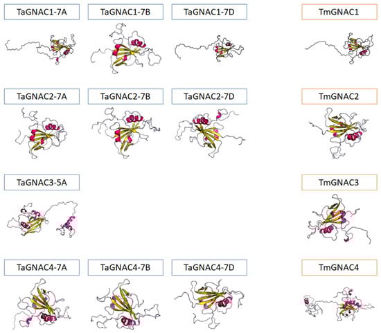 To investigate the conservation of the protein structure in the NAC preferentially expressed in grain, we modelled the tertiary structure of the TaGNAC and TmGNAC as an example (Figure 2). This result shows that the structure of the studied proteins is conserved, with four main beta-sheets and two alpha-helix in a central position of each protein.