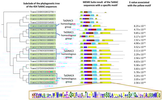 After comparing the set of 488 TaNACs from the RefSeqv1.0 database [], only 454 sequences were retrieved from the new protein database (RefSeq v2.1). The presence of conserved motifs was investigated among these protein sequences. Among the 20 motifs identified, a 68 aa motif was present in the C-terminal part of 17 sequences belonging to a clade of the phylogenetic tree consisting of 21 sequences in total (Figure 3) corresponding to the NAC-d subfamily, with an e-value of 1.9 × 10−182. Guérin et al. (2019) identified 19 TaNAC genes preferentially expressed in grain []. Sixteen of these 19 sequences are contained in the same clade. Of these, 14 sequences carry the 68 aa-motif.
