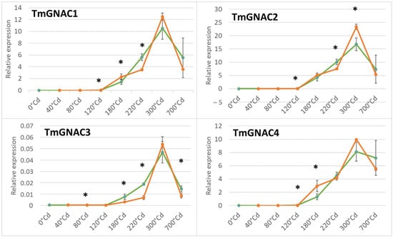 Expression profile of the TmGNAC1, TmGNAC2, TmGNAC3, and TmGNAC4 genes in einkorn grain during eight developmental stages. The expression was monitored in control (19 °C, green curve) and moderate thermal stressed condition (27 °C during 10 days after anthesis, orange curve). * = significant difference between control and stressed conditions (T test, p-value < 0.05). The significant difference observed at 120 °Cd after anthesis for the TmGNAC1, TmGNAC2 and TmGNAC4 reveals a higher expression in the control condition compared to the stressed condition.