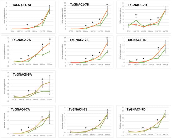 Expression profile of the homeologs of TaGNAC1, TaGNAC2, TaGNAC3, and TaGNAC4 in bread wheat grain during six developmental stages. The expression was monitored in control (19 °C, green curve) and moderate thermal stressed condition (27 °C during 10 days after anthesis, orange curve). * = significative difference between control and stressed conditions (T test, p-value < 0.05).