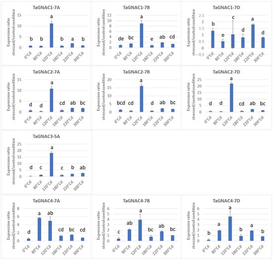 The expression level of the 10 homeologs was monitored during seed development also in response to heat stress. Overall, the expression profile of the four TaGNAC homeologs is similar in the control condition and in response to moderate heat stress, i.e., the expression is minimal in the early phases, then increases during the cell division phase of grain development and finally reaches a plateau around 300 °Cd (Figure 5). However, the phase of increased expression seems to be earlier in response to heat stress. Indeed, a statistically higher level of expression has to be noticed in the stressed condition compared to the control condition at 120 °Cd (except for TaGNAC1-7D) and 220 °Cd stages. However, either in the control condition or in response to temperature, the relative expressions between each TaGNAC remain similar; TaGNAC3-5A shows the lowest expression, followed by TaGNAC2-7A; while TaGNAC1-7B and TaGNAC4-7D possess the highest expression. To estimate more accurately the effect of the stress response, the ratio of the expression under stressed vs. control conditions was performed for each homeolog and each stage in bread wheat (Figure 6). The results indicated that, despite a variable intensity of expression between the genes studied, there was a maximal difference at 120 °Cd after anthesis between control and stressed conditions for all the homeologs studied, suggesting a key stage of response to heat stress at that particular stage. Indeed, except for TaGNAC1-7D, which shows an almost non-existent response to temperature (ratio stress/ctrl = 1.05), the three TaGNAC4 homeologs present the weakest response to stress (3.91, 4.54, 4.95, respectively, for TaGNAC4-7B, TaGNAC4-7D and TaGNAC4-7A). In contrast, TaGNAC2-7D shows the highest ratio, with a 22.06-fold higher expression level in response to stress, compared to the control condition. Similarly, TaGNAC3-5A, which shows the lowest relative expression level among the four genes (=10 homeologs) studied, is the 2nd gene whose expression is the most increased in response to heat stress (18.27 times more cDNA in the stressed 120 °Cd grain samples than in the controls). Thus, some genes show high expression during development but a weak response to stress (such as TaGNAC4 homeologs) while others are more weakly expressed during development but respond to stress significantly (such as TaGNAC3-5A). Regarding the three TaGNAC1 homeologs, homeologs 7B and 7D are the most highly expressed at all stages. However, the ratio of stressed vs. controlled expression at 120 °Cd shows that the homeolog A is upregulated under stress, compared to the control condition. For TaGNAC2, a similar result was observed: TaGNAC2-7D shows a relatively low expression level but the highest stress response amplitude among the three homeologs.
