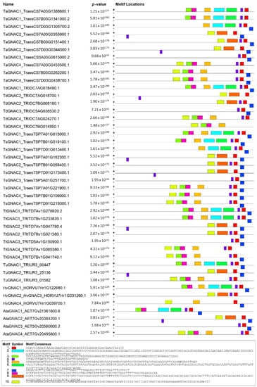 Identification of conserved motifs in the promoter (2000 bp upstream of the CDS) of the four bread wheat TaGNAC genes homeologs and their orthologs in 13 cereal species. Ata: Aegilops tauschii, Bd: Brachypodium distachyon, Hv: Hordeum vulgare, Os: Oryza sativa, Ph: Panicum hallii, Sb: Sorghum bicolor, Sin: Sesamum indicum, Sit: Setaria italica, Ta: Triticum aestivum, Td: Triticum dicoccoides, Ts: Triticum spelta, Tt: Triticum turgidum, Tu: Triticum urartu, Zm: Zea maya.