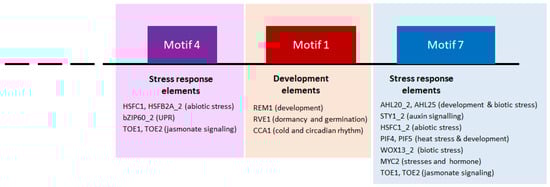 Schematic representation of the cis-elements belonging to the three identified conserved motifs among the 14 orthologous Triticeae GNAC genes. Only the 3′ terminal part of the promoter is represented (stopped at the beginning of the 5′UTR). The motif 1 gathers cis-elements that may be involved in plant development. Motifs 4 and 7 present cis-elements that are involved in stress responses.