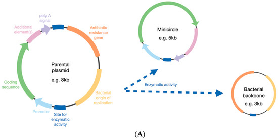 DNA minicircles were first described in 1997 [6] and are generated from a parental plasmid (Figure 1). The transgene of interest is cloned into the plasmid backbone, but the bacterial elements of the plasmid are then removed, which can be achieved by the activity of enzymes such as Cre-mediated excision [7], Flp recombinase [8], λ integrase [9,10], or ϕC31 integrase [11]. Initial concerns over the production quality of minicircles have since been allayed, and yields have been improved in addition to reducing contamination from the parental plasmid [12,13]. In doing this, the size of the construct can be reduced by 2–3 kb, depending on the backbone size in the parental plasmid.