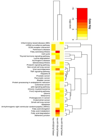 - Vlachos, I.S.; Zagganas, K.; Paraskevopoulou, M.D.; Georgakilas, G.; Karagkouni, D.; Vergoulis, T.; Dalamagas, T.; Hatzigeorgiou, A.G. DIANA-MiRPath v3.0: Deciphering MicroRNA Function with Experimental Support. Nucleic Acids Res. 2015, 43, W460–W466. [Google Scholar] [CrossRef]