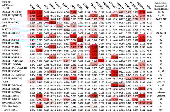 Heatmap of AISIDscores from 29 bait proteins (27 TNFRSF members, TNFα nanobody for positive control, Hsp40Hdj1 for negative control) against 18 TNFSF members. The AISIDscore of correct pairings between bait protein and TNFSF members are underlined. For each TNFRSF member, AISIDscores were ranked among 18 TNFSF members, with the ranking positions of the correct pairs are listed at the rightmost column. Three TNF receptor (NGFR, TROY, and DR6) do not have known ligands in TNFSF members and are labeled as “unknown”. The human Hsp40Hdj1 is labeled as “none”.