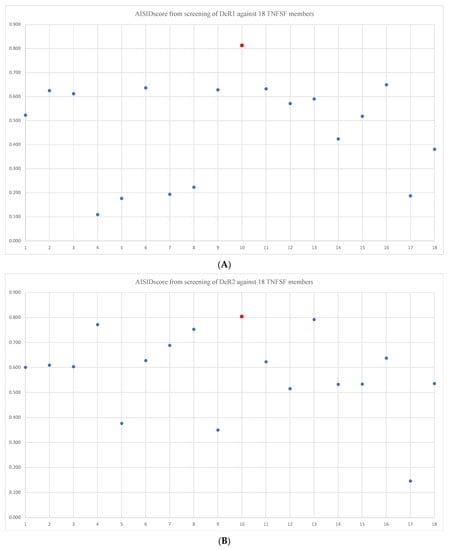 To test our method, 27 human TNFRSF members and 18 human TNFSF members were utilized. In all, 24 TNFRSF members out of the 27 can specifically bind at least one of the 18 TNFSF members as documented by the Uniprot database []. The specific binding between a TNFRSF member and its ligand TNFSF member(s) leads to distinct signaling pathways, including cell apoptosis, inflammation, and proliferations [,]. In each test, two protein sequences, one from a TNFRSF member and the other from a TNFSF member, were input into the AlphaFold-Multimer. The whole screening test generated a panel of AISIDscores for 27 × 18 pairs of TNFRSF and TNFSF members. For each TNFRSF member (as a bait protein), we ranked the AISIDscore among the 18 TNFSF members. The correct pairing was revealed as the highest AISIDscore for 13 out of 24 TNFRSF members, which have known specific interactions with TNFSF members. Out of the 33 correct pairings between TNFRSF and TNFSF members, 28 pairs could be found in the top five (including 25 pairs in the top three) seats of the AISIDscore rankings (Figure 1). The AISIDscore ranges from 0.02 to 0.85 with an average value of 0.46 for all pairs, and a much higher average value of 0.74 for the correct pairs. As a negative control, the AISIDscores between Hsp40 Hdj1 and TNFSF members were also calculated, resulted in a much lower average value of 0.15.