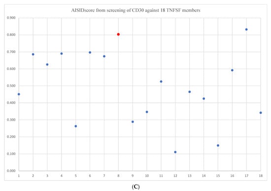 Plot of AISIDscores from screening the TNFRSF members, which do not have solved complex structures. (A–C), represent DcR1, DcR2, and CD30, respectively, with the 18 TNFSF members in same order as Figure 1. The red circle indicates the correct pairing.